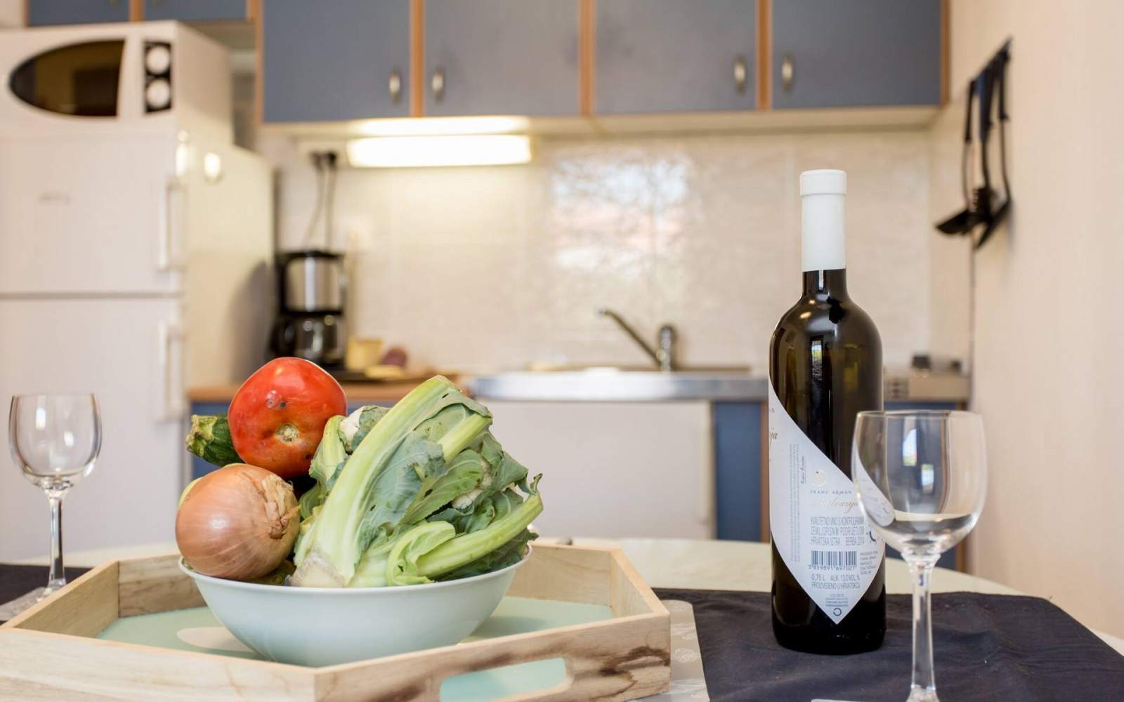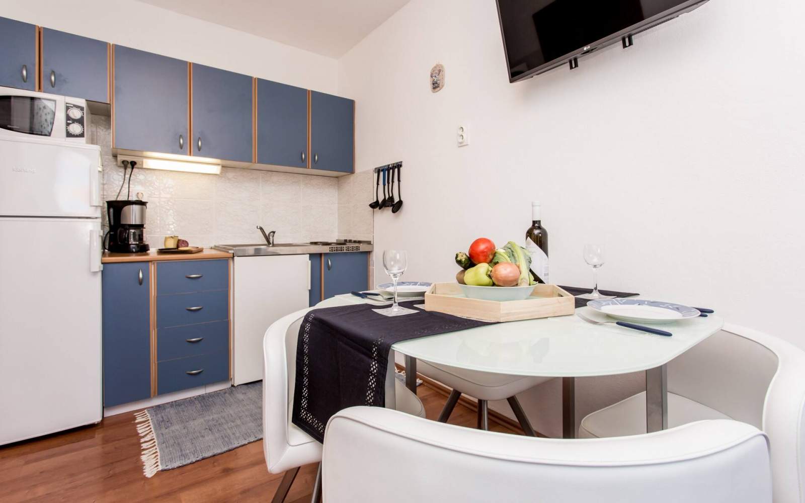 Die Küche ist komplett mit modernen Annehmlichkeiten ausgestattet, darunter ein Elektroherd mit 2 Kochplatten, ein Kühlschrank mit Gefrierfach, eine Kaffeemaschine, ein Wasserkocher, eine Mikrowelle, ein Toaster und ein Stabmixer. Die Küche verfügt außerdem über einen Essbereich, der nahtlos mit dem Wohnbereich verbunden ist und in dem Sie einen Fernseher mit Satelliten- und Kabelkanälen sowie eine Klimaanlage für Ihren Komfort finden.