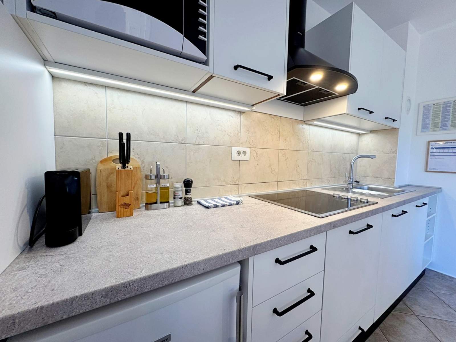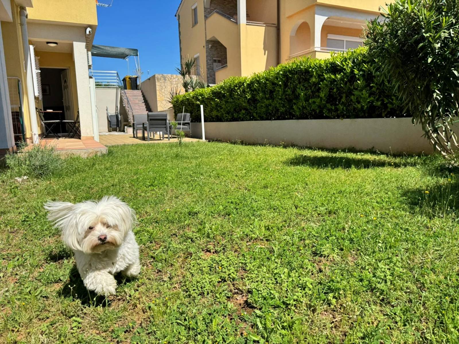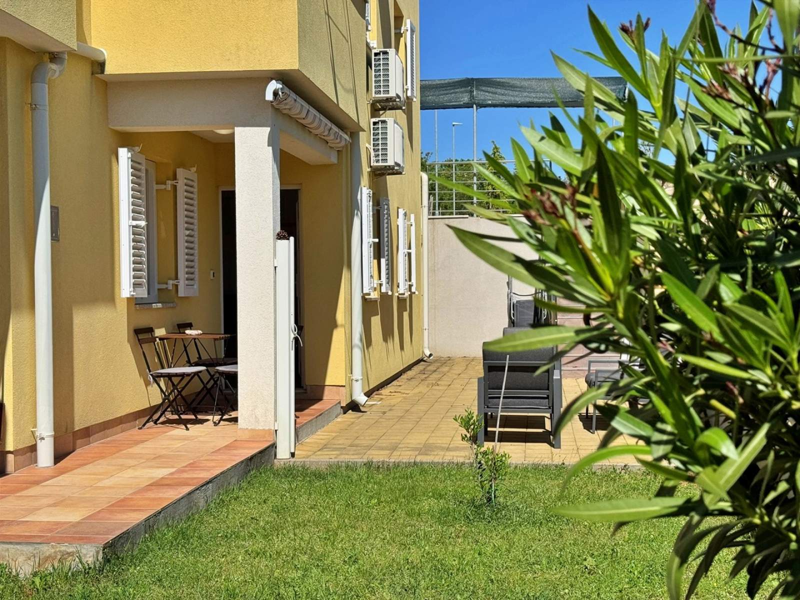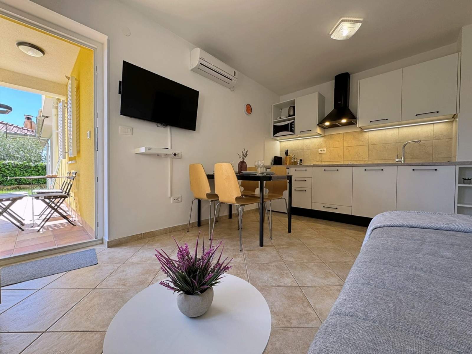Dieses Apartment im Erdgeschoss bietet eine 20 m2 große private Terrasse mit Gartenblick. Die klimatisierte Küche mit Wohnbereich ist ausgestattet mit einem Keramikkochfeld, einem Kühlschrank mit Gefrierfach, einer Nespresso-Kaffeemaschine, einem Wasserkocher, einer Mikrowelle, einem Toaster, einem Esstisch, einer ausziehbaren Couch für zwei Personen, Kabel-/Sat-TV und WLAN. Vom Wohnbereich gelangen Sie direkt auf die Terrasse. Das Schlafzimmer verfügt über ein Doppelbett, und das Badezimmer ist mit einer Dusche, Toilette und einem Haartrockner ausgestattet. Im Hof gibt es einen gemeinsamen Grillplatz und Terrasse, und ein privater Parkplatz steht kostenlos vor dem Gebäude zur Verfügung. Haustiere sind gegen eine zusätzliche Gebühr willkommen, und ein Babybett ist auf Anfrage erhältlich.