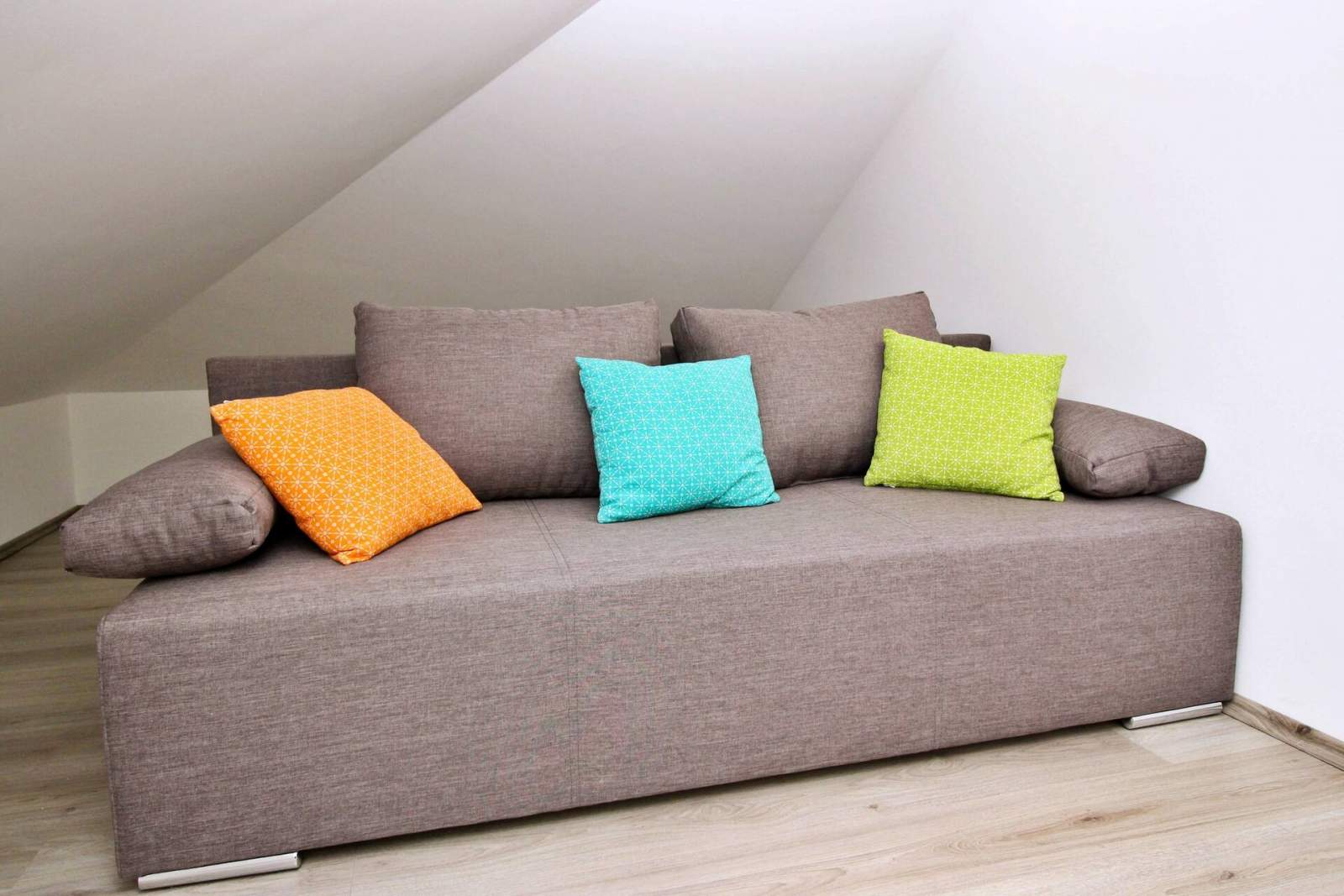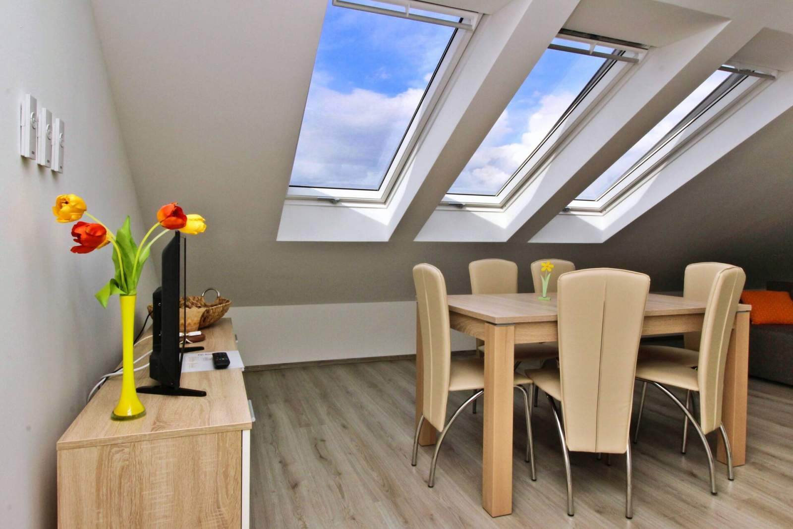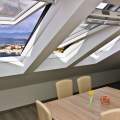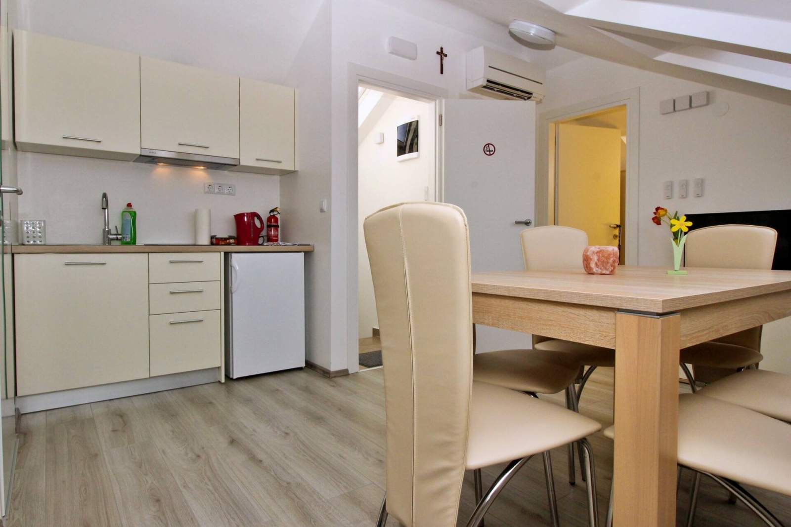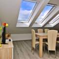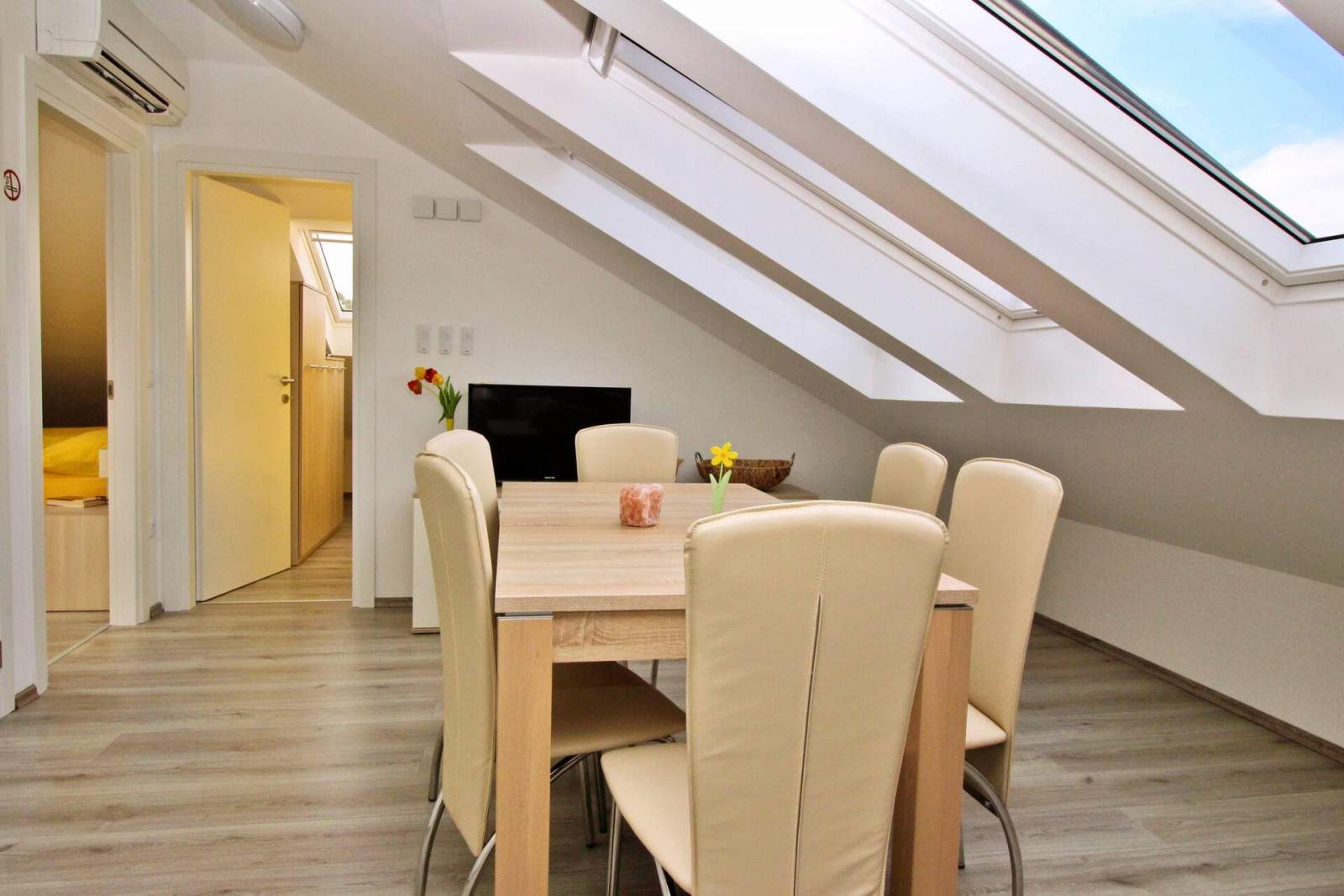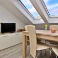 Dieses gemütliche Dachgeschossapartment liegt nur 60 Meter von einem Sandstrand und 250 Meter vom Stadtzentrum entfernt und ist ideal für Familien oder Gruppen von 4-6 Gästen. Es verfügt über zwei klimatisierte Schlafzimmer, jedes mit einem Doppelbett, und ein Wohnzimmer mit einem Ausziehsofa für zwei weitere Gäste. Der offene Essbereich bietet einen wunderschönen Meerblick. Die Küchenzeile ist gut ausgestattet mit einem Elektroherd, einem Minikühlschrank mit Gefrierfach, einer Kaffeemaschine, einem Wasserkocher und einer Mikrowelle.