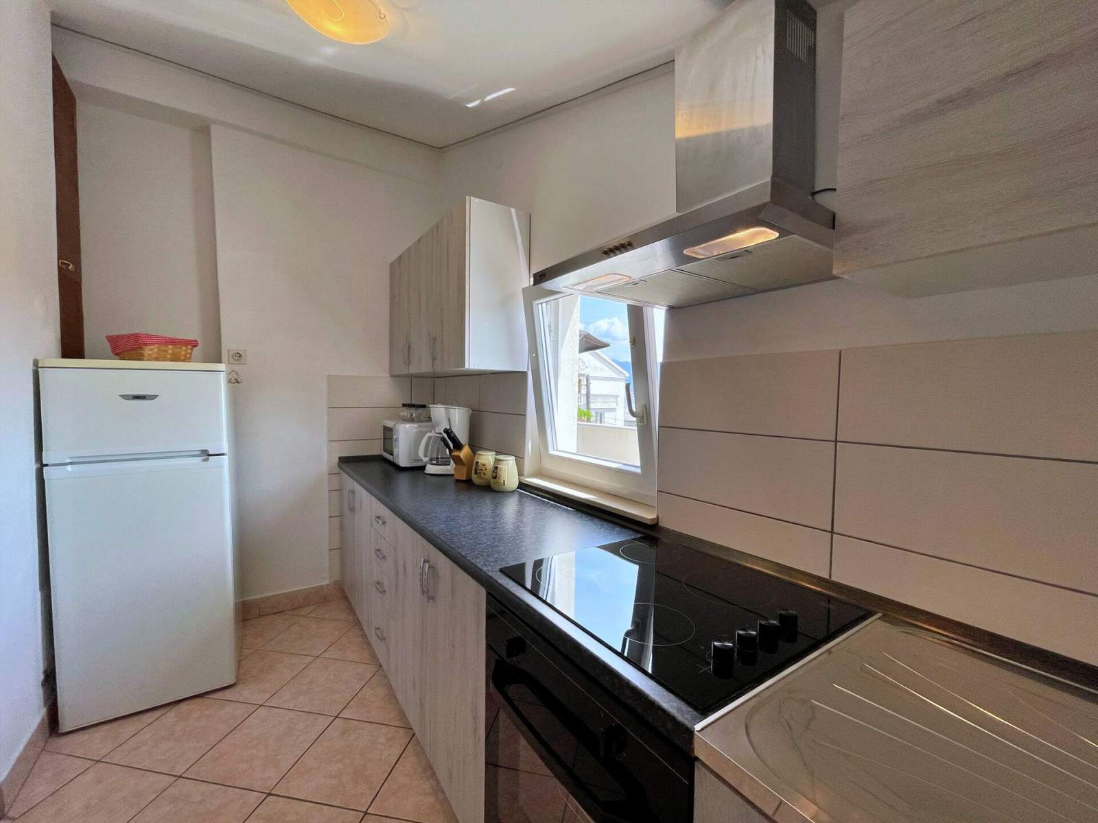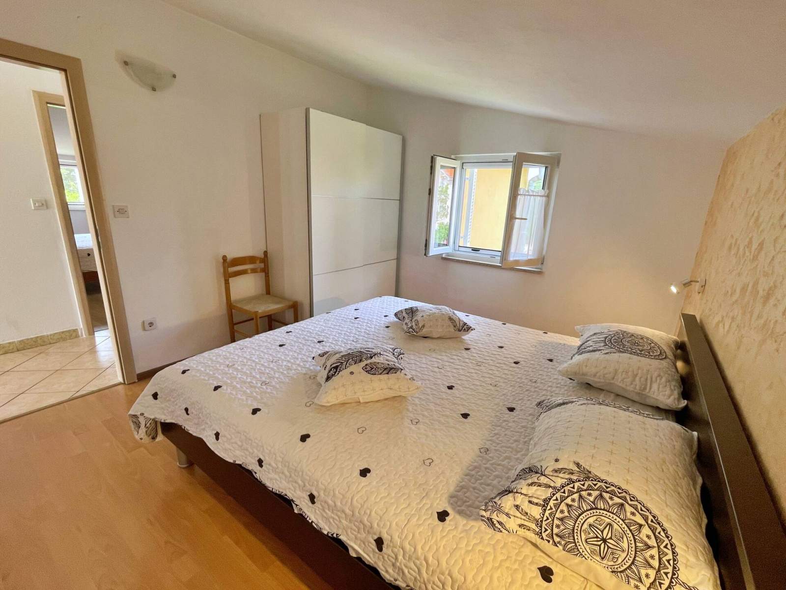 Dieses Apartment im ersten Stock, etwa 700 Meter vom Meer entfernt, ist ideal für Familien oder kleine Gruppen, die Komfort und Bequemlichkeit suchen. Es verfügt über drei Schlafzimmer mit jeweils einem Doppelbett sowie eine ausziehbare Couch im Wohnzimmer. Die geräumige, teilweise überdachte Terrasse (30 m2) bietet einen Essbereich mit Meerblick. Die voll ausgestattete Küche verfügt über einen Cerankochfeld, einen Kühlschrank mit Gefrierfach, einen Backofen, eine Mikrowelle, einen Toaster, eine Kaffeemaschine und einen Wasserkocher. Das Wohnzimmer verfügt über eine Klimaanlage, eine gemütliche Couch und einen Essbereich mit Satelliten-/Kabelfernsehen. Das Badezimmer ist mit einer Dusche, einer Toilette, einer Waschmaschine und einem Haartrockner ausgestattet. Zu den weiteren Annehmlichkeiten gehören kostenloses WLAN, Parkplätze, ein gemeinsamer Grill im Hof ??und ein Babybett auf Anfrage. Haustiere sind gegen eine zusätzliche Gebühr ebenfalls willkommen!