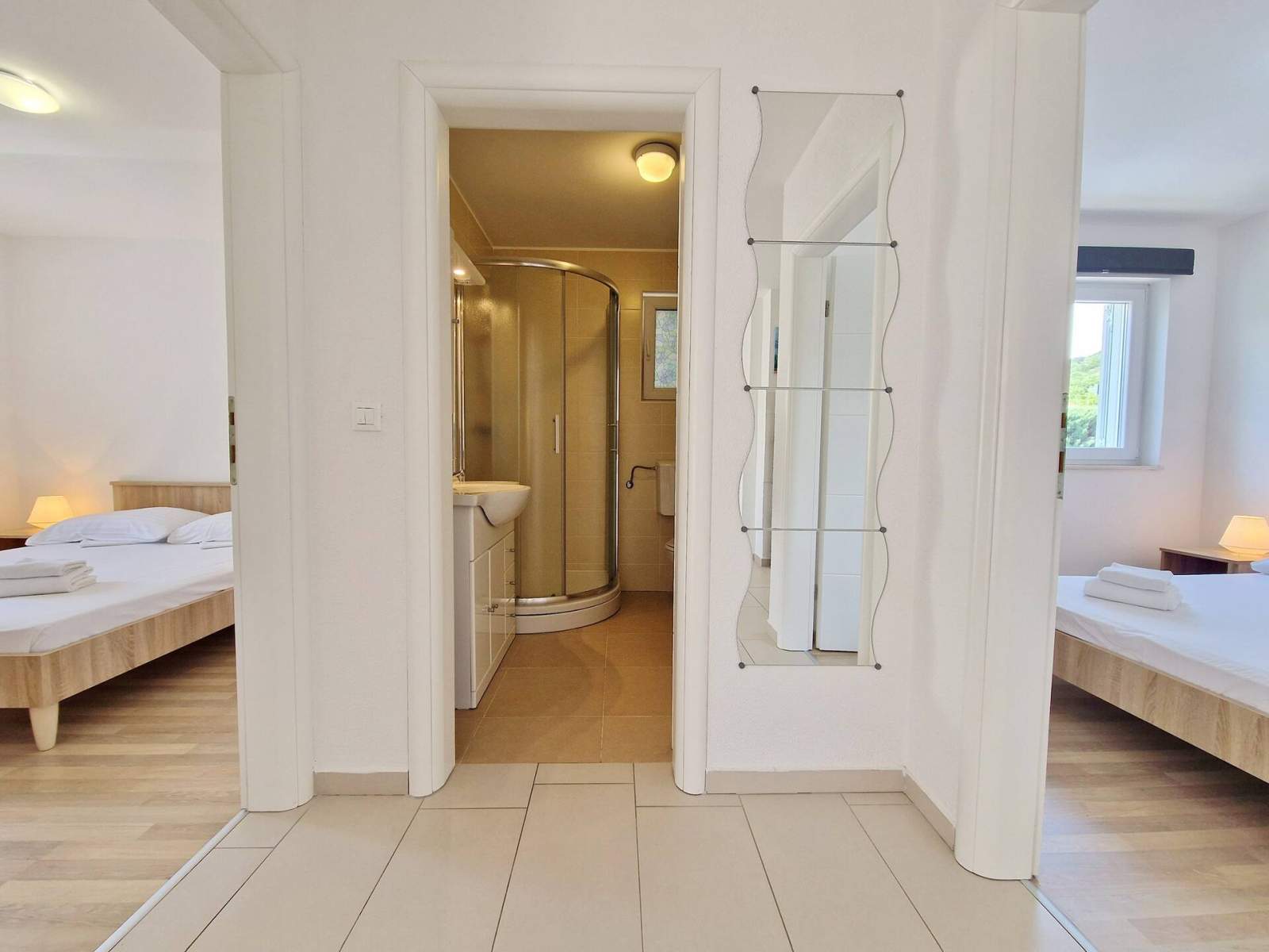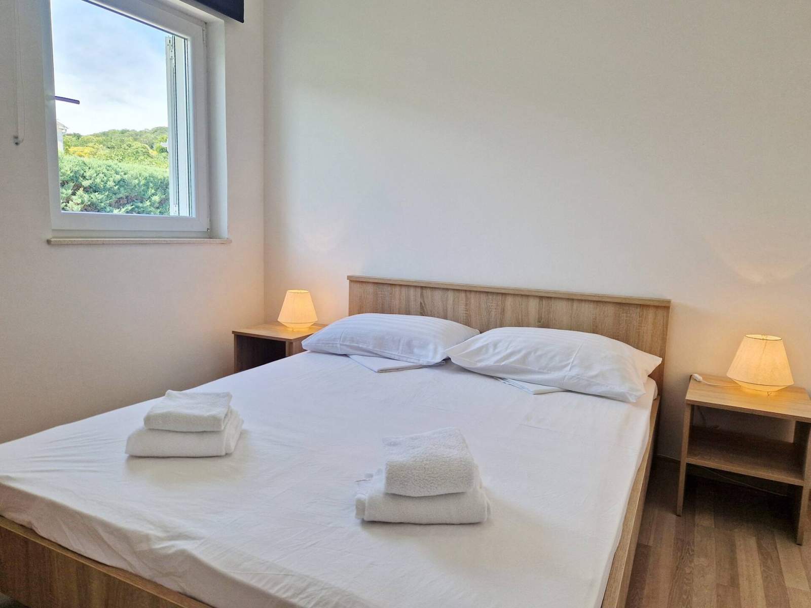 Es hat 2 Schlafzimmer (mit Doppelbett), eine voll ausgestattete Küche mit Wohnzimmer, ein Badezimmer (Dusche, WC) und einen Balkon (5 m2).