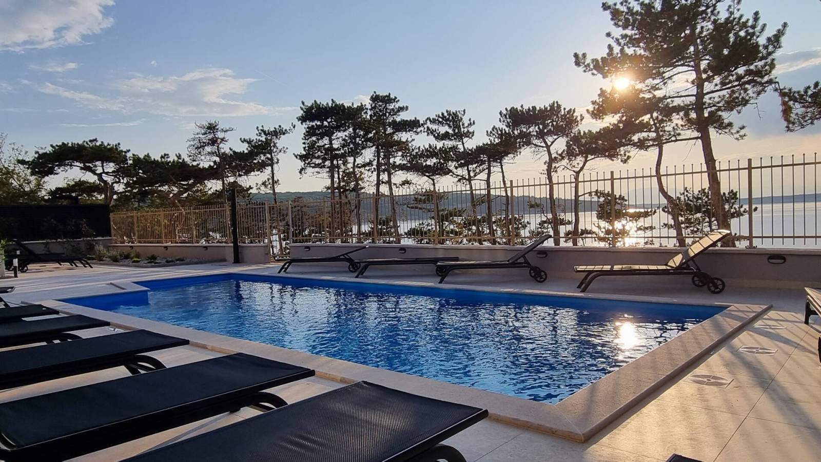 Die überdachte Terrasse des Apartments (10 m2) bietet direkten Zugang zum Poolbereich und eine wunderschöne Aussicht auf den Pool und das Meer. Der Poolbereich ist mit Sonnenliegen, Sonnenschirmen und einer Außendusche ausgestattet und bietet direkten Zugang zum Meer zum bequemen Schwimmen. Ein gemeinsamer Waschraum im Erdgeschoss umfasst eine Waschmaschine, Waschkapseln/Waschmittel und ein Bügeleisen zur Nutzung durch die Gäste.