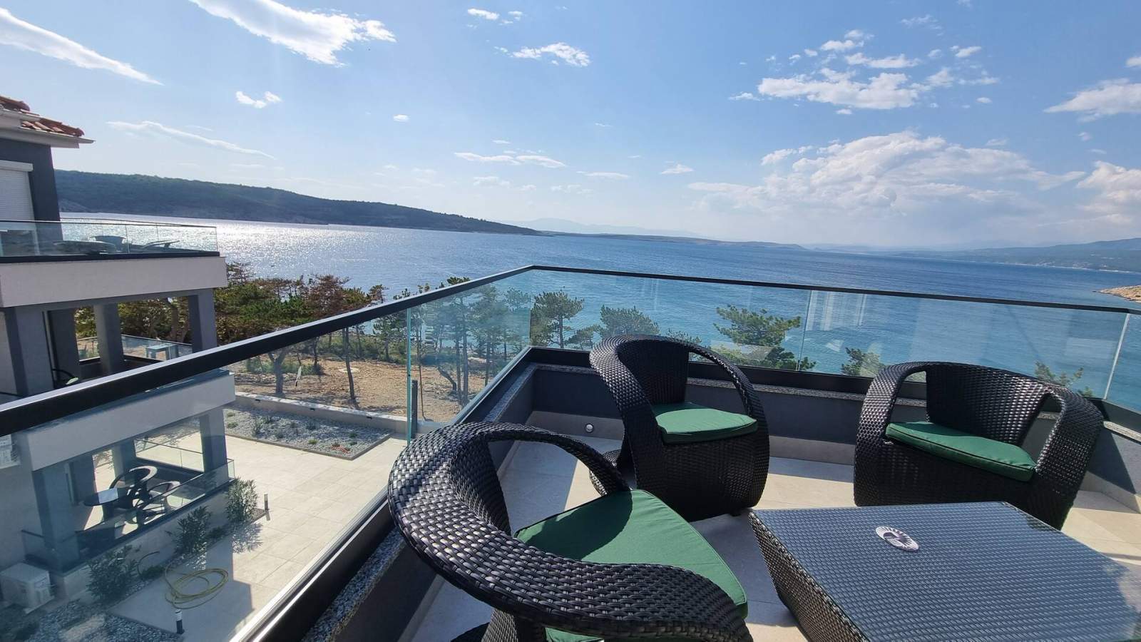 Der Balkon (10 m2) bietet eine wunderschöne Aussicht auf den Pool und das Meer. Der Poolbereich im Erdgeschoss ist mit Sonnenliegen, Sonnenschirmen und einer Außendusche ausgestattet und bietet direkten Zugang zum Meer zum bequemen Schwimmen. Ein gemeinsamer Waschraum im Erdgeschoss umfasst eine Waschmaschine, Waschkapseln/Waschmittel und ein Bügeleisen zur Nutzung durch die Gäste.