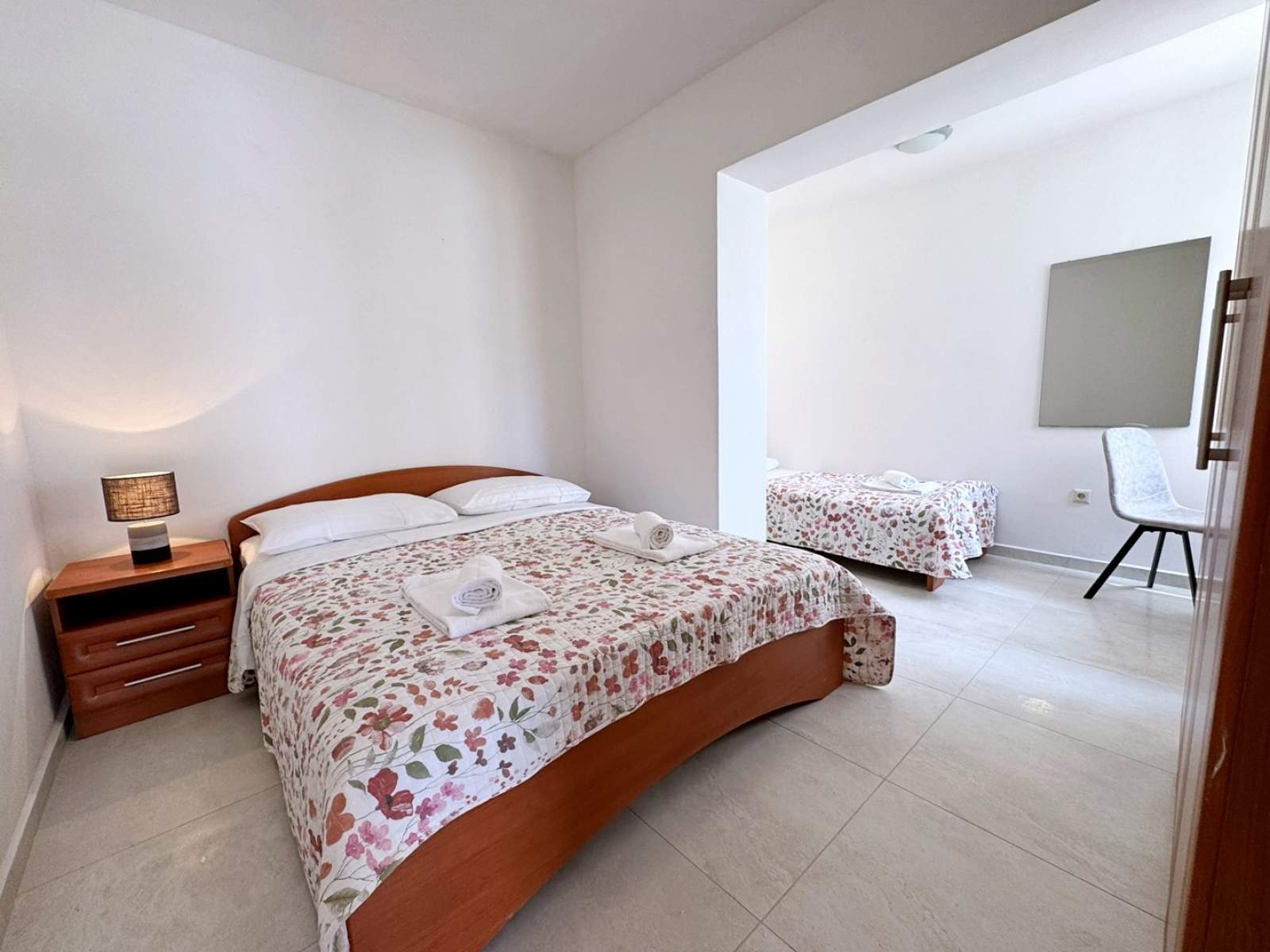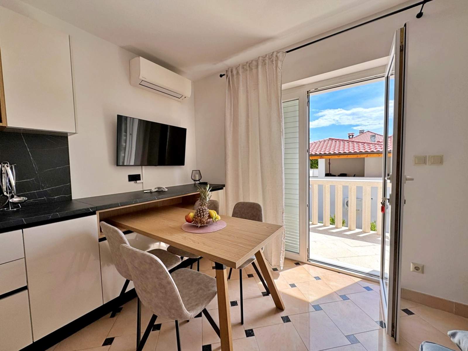 Dieses einladende Apartment liegt nur 20 m vom Meer und einem Sandstrand entfernt und bietet den perfekten Rückzugsort am Meer. Es befindet sich im ersten Stock und verfügt über ein Schlafzimmer mit einem Doppelbett und einem Einzelbett, eine Küche mit einem ausziehbaren Schlafsofa für eine Person, einen Esstisch, Klimaanlage und einen Smart-TV. Die Küche ist mit einem Elektroherd, einer Mikrowelle, einem Geschirrspüler, einem Kühlschrank mit Gefrierfach, einer Kaffeemaschine und einem Wasserkocher ausgestattet. Das Wohnzimmer verfügt über ein Sofa, einen Fernseher, eine Klimaanlage und einen privaten Balkon mit Meerblick.