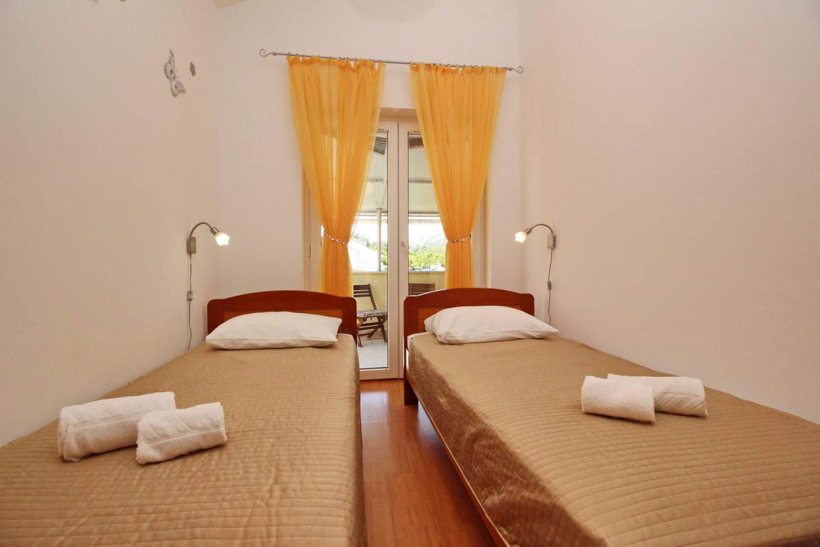 Diese Ferienwohnung, die sich im ersten Stock befindet, ist ideal für 4-5 Personen und bietet eine Gesamtwohnfläche von etwa 50 m2. Sie umfasst zwei Schlafzimmer: eines mit einem Queensize-Bett und ein weiteres mit zwei Einzelbetten, was flexible Schlafmöglichkeiten für die Gäste bietet.