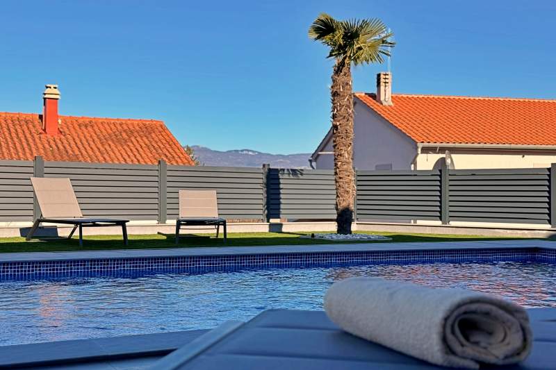 Located in the peaceful village of Donja Hlapa on Krk, this modern, cozy villa accommodates up to 8 guests. It features 4 bedrooms with en-suite bathrooms, a bright open-plan living area with fully equipped kitchen, free Wi-Fi, and air conditioning. Enjoy a private pool, hot tub, patio with BBQ, balcony access, washing machine, and parking in front of the house.