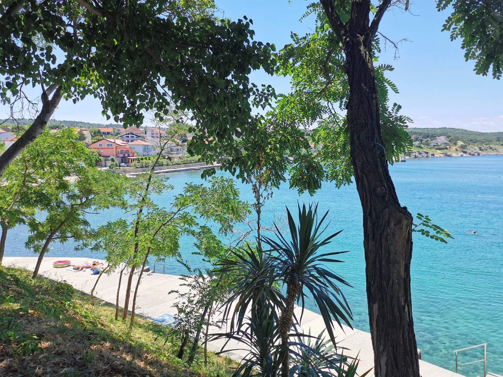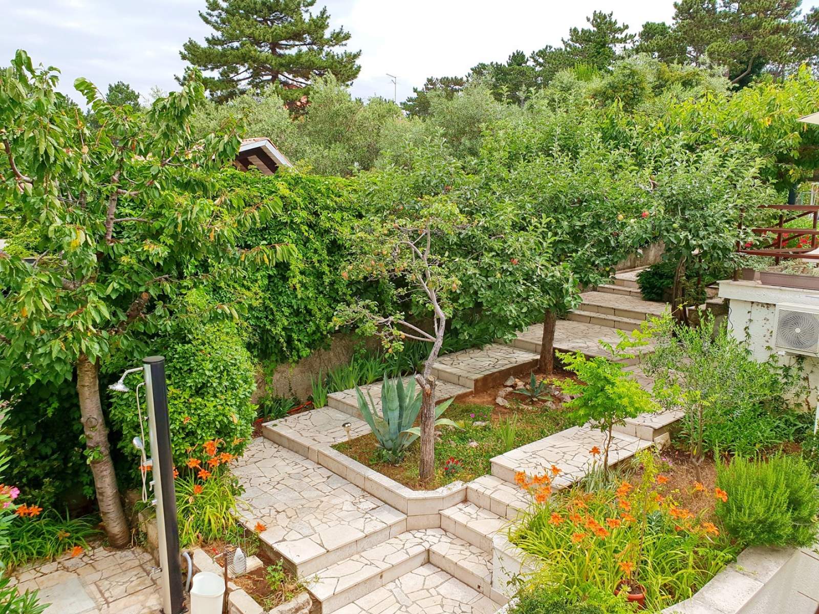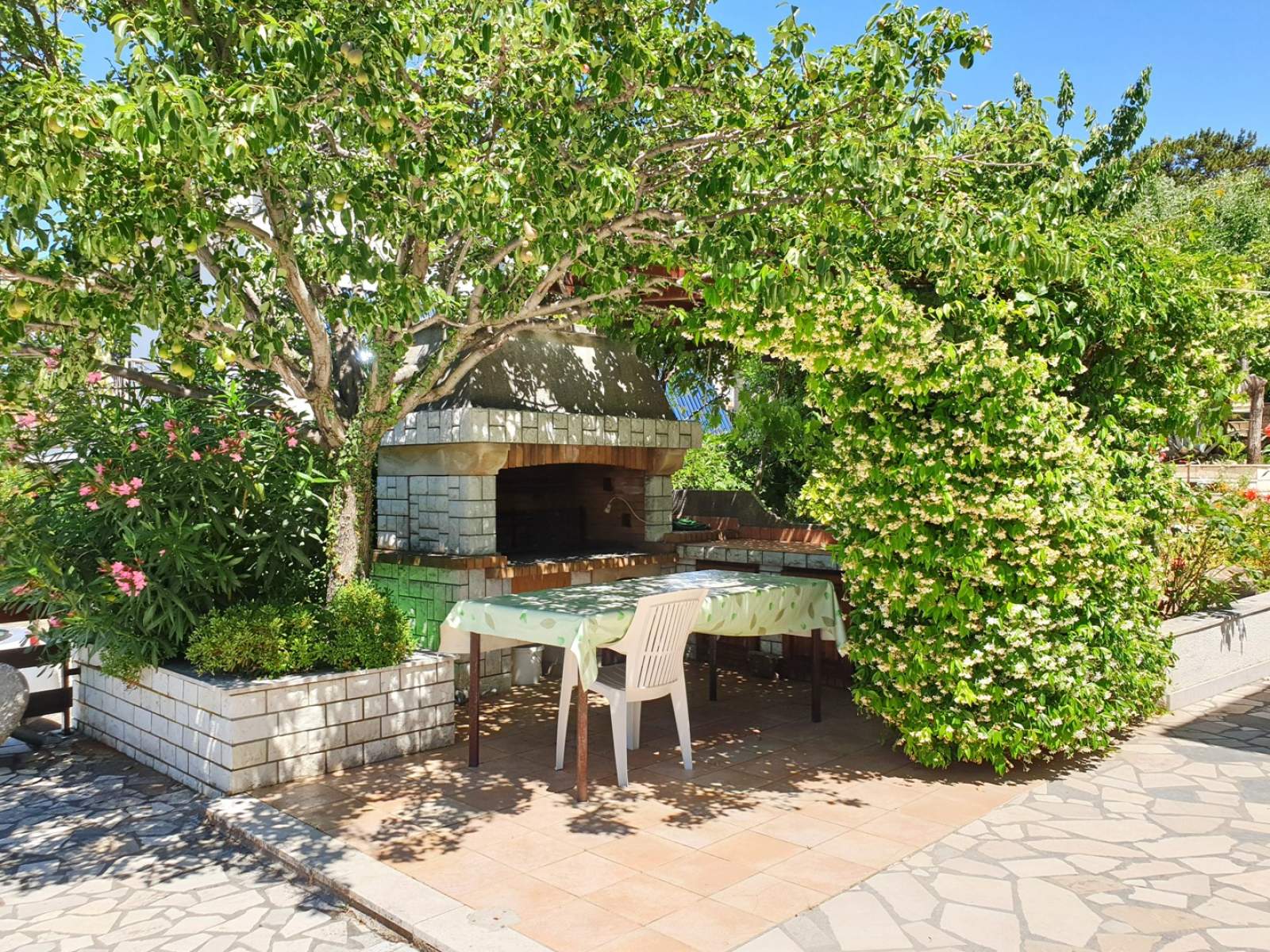 This charming apartment, perfect for 2 to 4 guests, is nestled in the romantic village of Šilo on the Island of Krk. It features a cozy indoor living space and a lovely terrace (20 m2), complete with a dining table, sun loungers, and an umbrella, right by the entrance. The apartment offers one bedroom with a queen-size bed and air conditioning, as well as a sofa bed for two in the living room. The kitchen is fully equipped with everything you need, including a ceramic stove, kettle, coffee maker, refrigerator with freezer, oven, and toaster. The living room includes a dining area, pull-out couch, and satellite TV. The BBQ is shared and located on a different terrace which has a sea view.