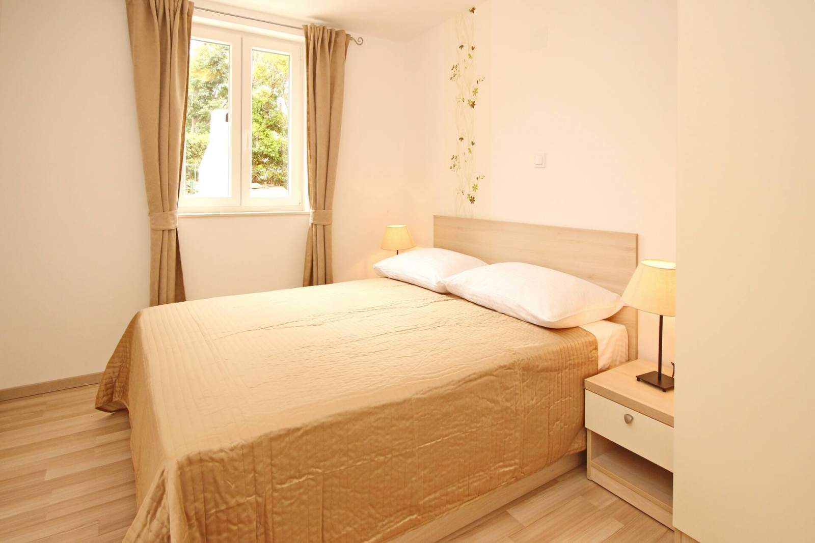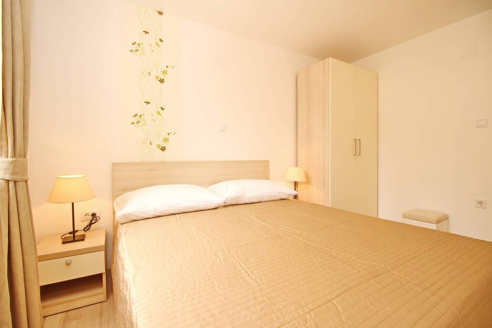 The apartment consists of one bedroom, a bathroom (shower, toilet, hair dryer, washing machine), and a bright living room with additional bed on the couch for 2 persons, air conditioning, SAT TV, free Wi-Fi and a fully equipped kitchen. The kitchen includes an electric stove, fridge with a freezer, dishwasher, microwave, coffee maker and kettle. Kitchen utensils are included.