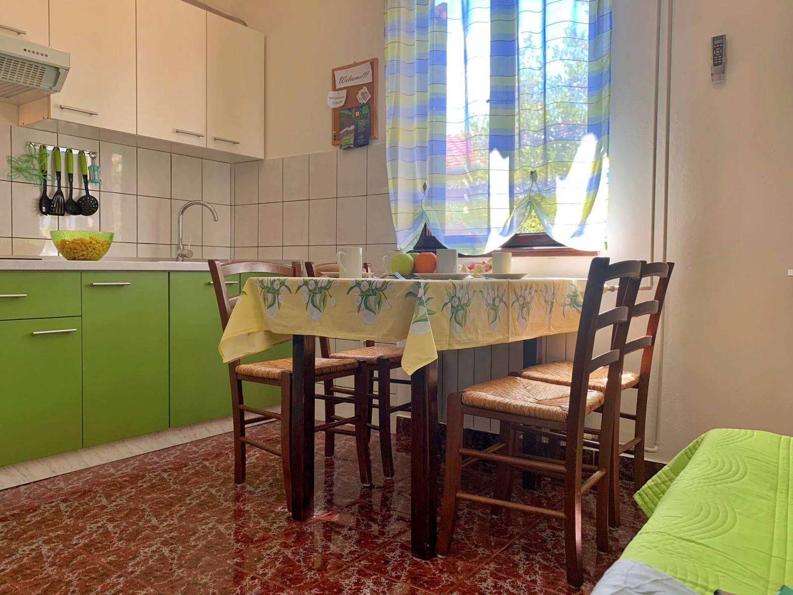 The apartment was pleasant, nicely and newly furnished, sea view from the balcony, well-equipped kitchen, washing machine, good location, we didn't miss anything. We were very satisfied with everything. You have to drive to the village 15 minutes away to pay the other half of the deposit, I would prefer to pay 100% in advance. The beds are too soft. The accommodation is not soundproofed, so you can hear every step of the people above you.
