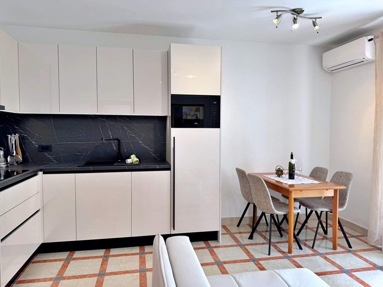 This inviting apartment is just 20 m from the sea and a sandy beach, offering the perfect seaside retreat. It is located on the first floor and features a bedroom with a queen-size bed, a living room with a pull-out sofa for two, a dining table, air conditioning and Wi-Fi. The kitchen is equipped with an electric stove, microwave, dishwasher, fridge with freezer, coffee machine, and kettle.