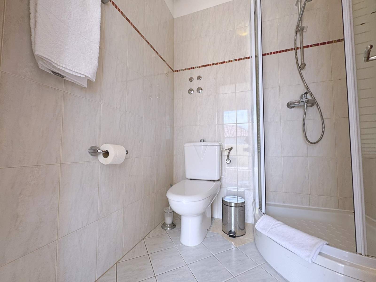 A 12 m2 balcony provides stunning sea views. The bathroom includes a shower, toilet, and hairdryer. Guests can enjoy an outdoor shower, a shared BBQ area, and private parking conveniently located behind the house.
