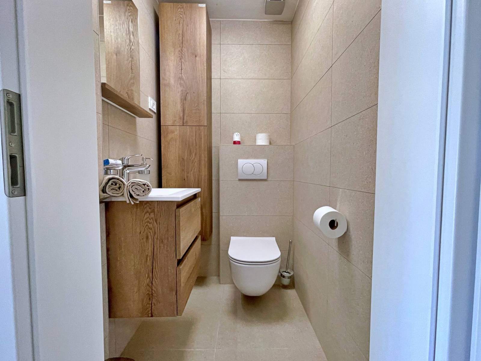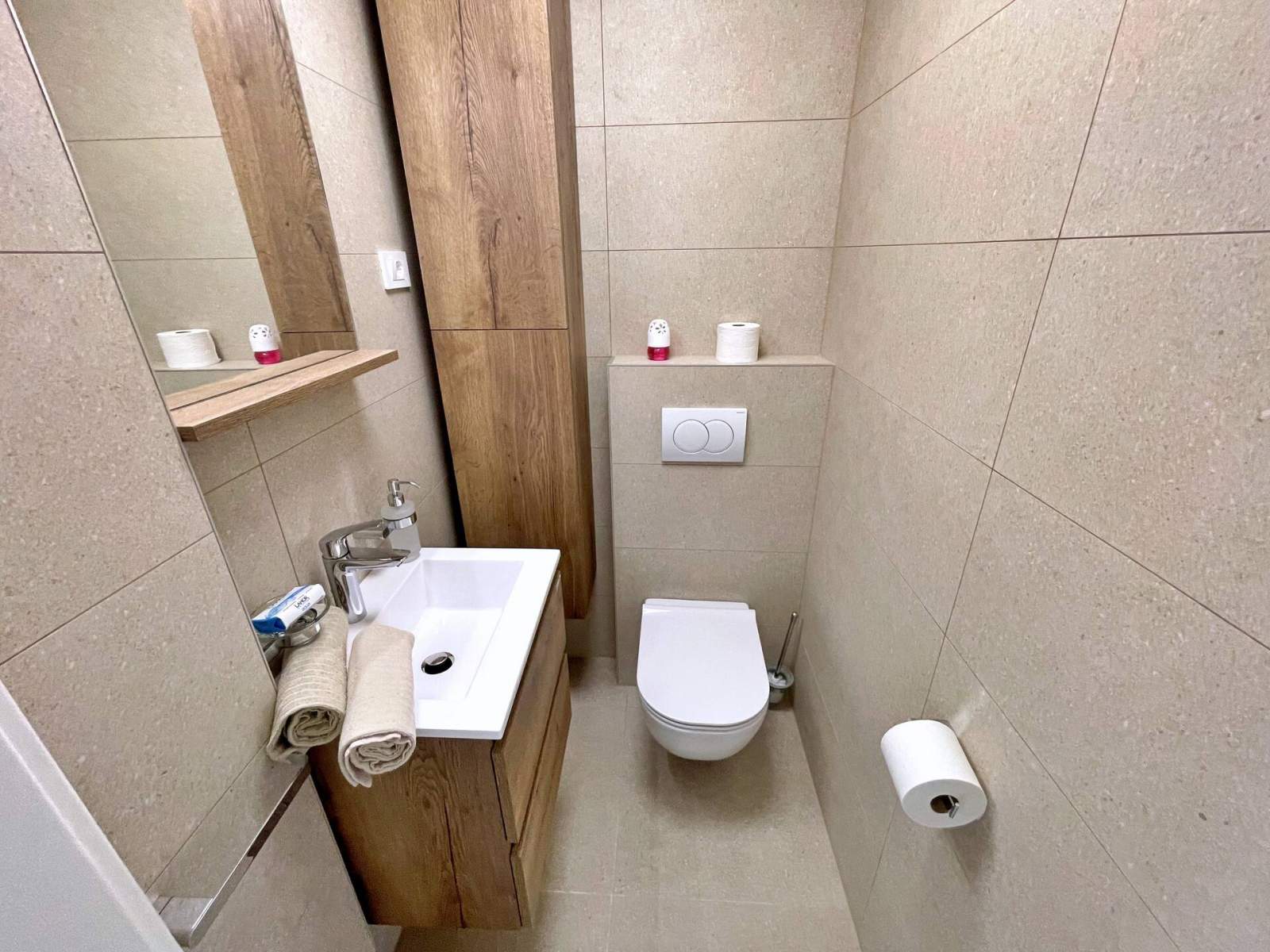 Apartman sadrži jednu kupaonicu s tuš kabinom, WC-om, dva umivaonika i perilicom/sušilicom rublja te odvojenu kupaonicu s WC-om i umivaonikom. Opustite se na natkrivenoj terasi od 12 m2 sa stolom za objedovanje i pogledom na zelenilo. Apartman također ima usisavač i glačalo. Klimatizacijski uređaji dostupni su u obje spavaće sobe iu kuhinji/dnevnom boravku, osiguravajući udobnost u cijelom stanu. Privatni ulaz se nalazi u prizemlju.