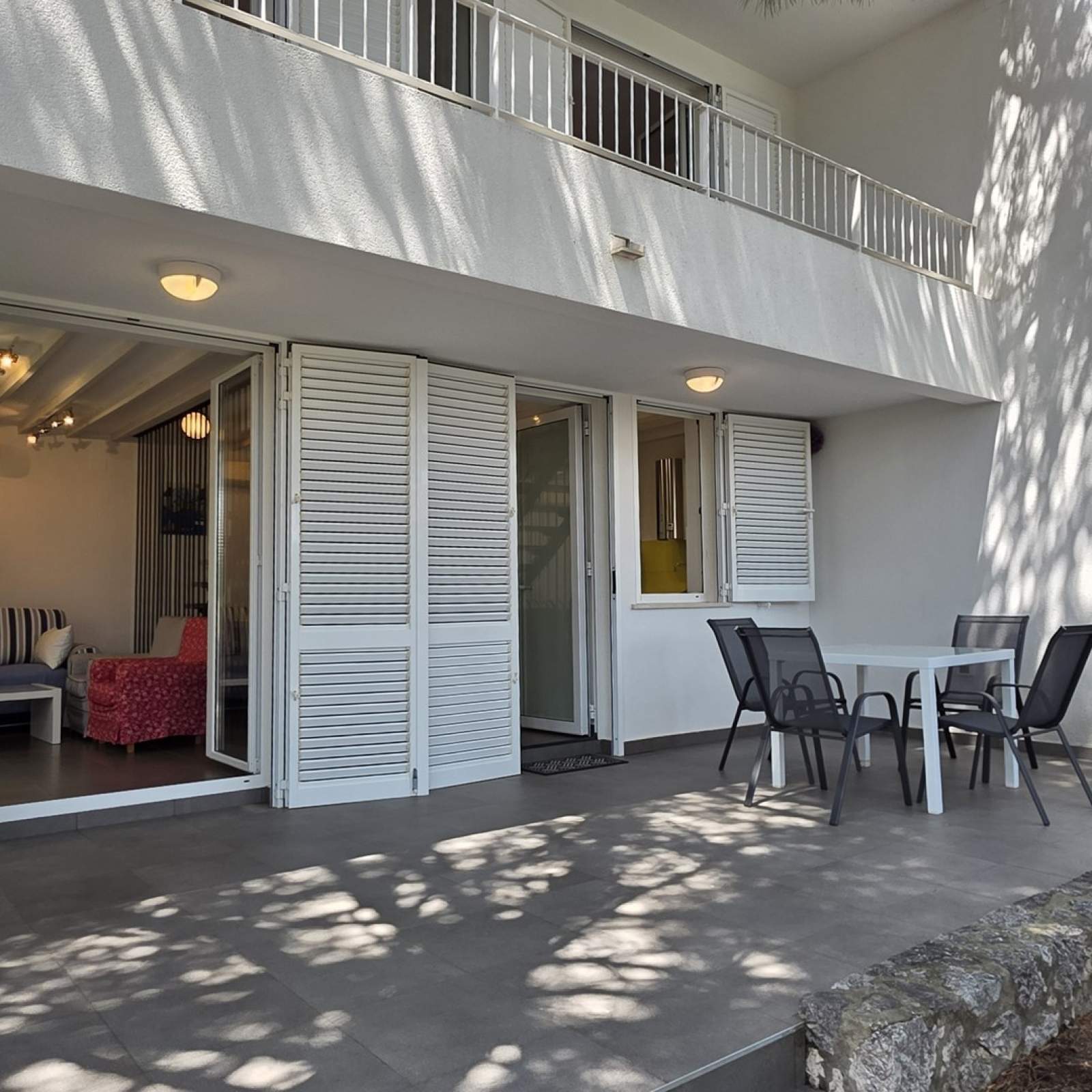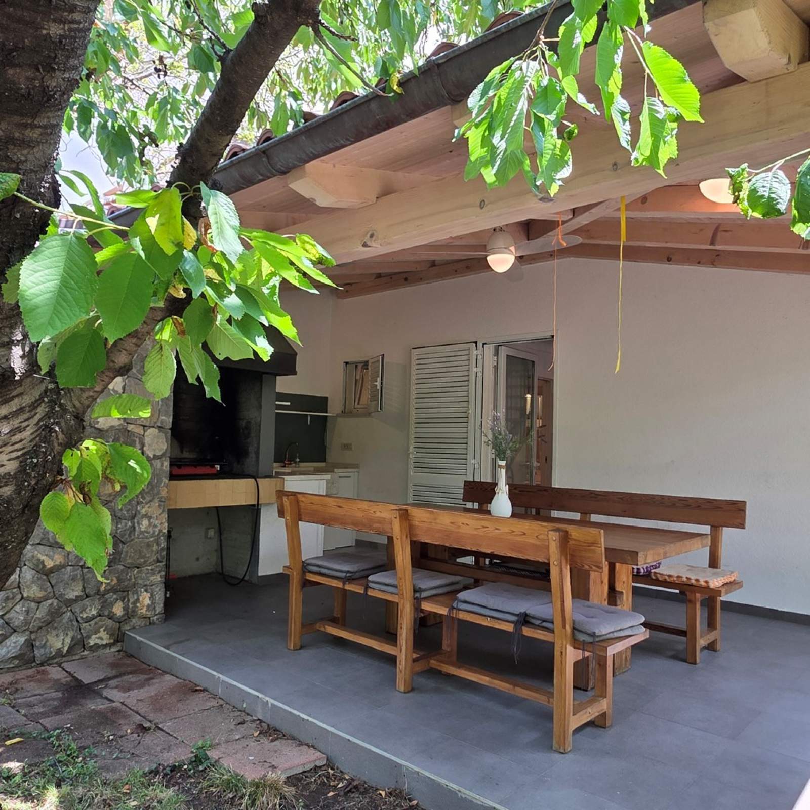 Raspolaže s dvije namještene terase. Veća terasa (25 m2) uključuje blagovaonski stol, ljetnu kuhinju i plinski roštilj.