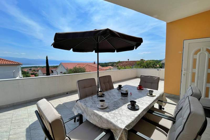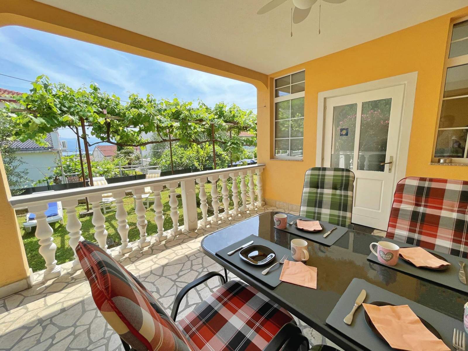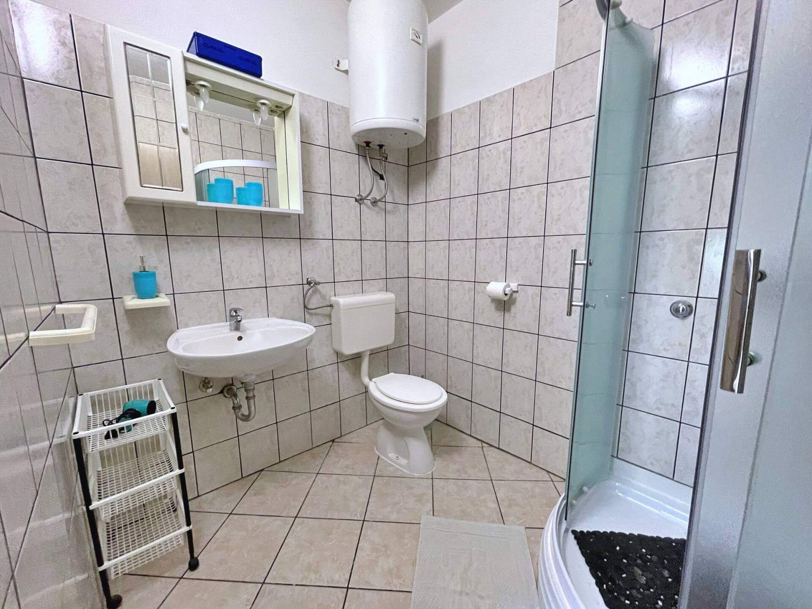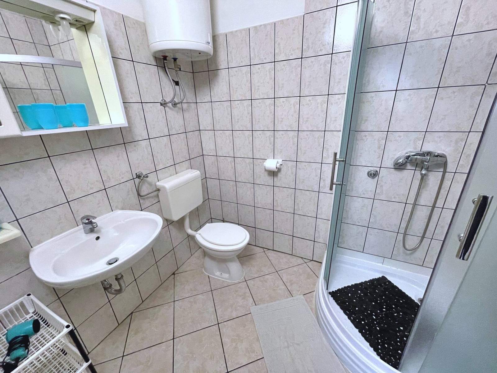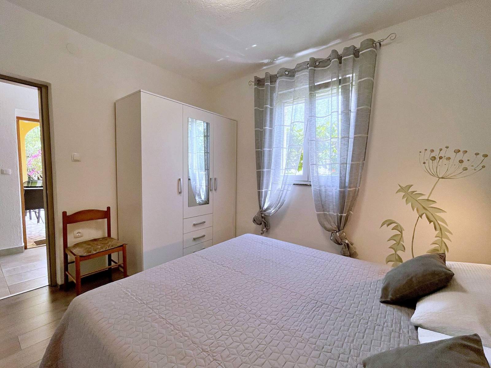 Ovaj apartman na povišenom prizemlju, udaljen oko 700 metara od mora, savršen je za boravak obitelji ili manjih grupa. Sadrži dvije spavaće sobe — jednu s bračnim krevetom i drugu s dva odvojena kreveta — te prostranu natkrivenu terasu (10 m2) s pogledom na privatni vrt s ležaljkama. Potpuno opremljena kuhinja uključuje električni štednjak (ceran-ploča), hladnjak sa zamrzivačem, pećnicu, mikrovalnu pećnicu, toster, aparat za kavu i kuhalo za vodu, uz blagovaonski stol i prostor za sjedenje sa satelitskom/kabelskom TV, Wi-Fi i klima uređajem. Kupaonica ima tuš, WC i sušilo za kosu. Dodatne pogodnosti uključuju besplatan parking, zajednički roštilj u dvorištu i dječji krevetić dostupan na upit. Kućni ljubimci su također dobrodošli uz nadoplatu!