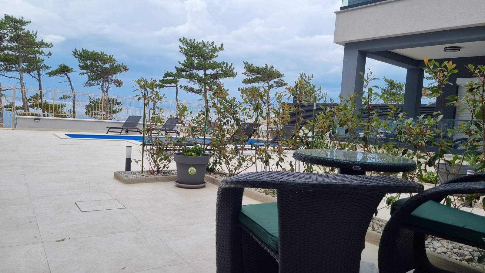 S namještene terase (15 m2) pruža se prekrasan pogled i na bazen i na more. Bazenski prostor u prizemlju opremljen je ležaljkama, suncobranima i vanjskim tušem te omogućuje izravan pristup moru za ugodno kupanje. Zajednička praonica rublja u prizemlju uključuje perilicu rublja, kapsule/deterdžent za pranje rublja i glačalo za goste.
