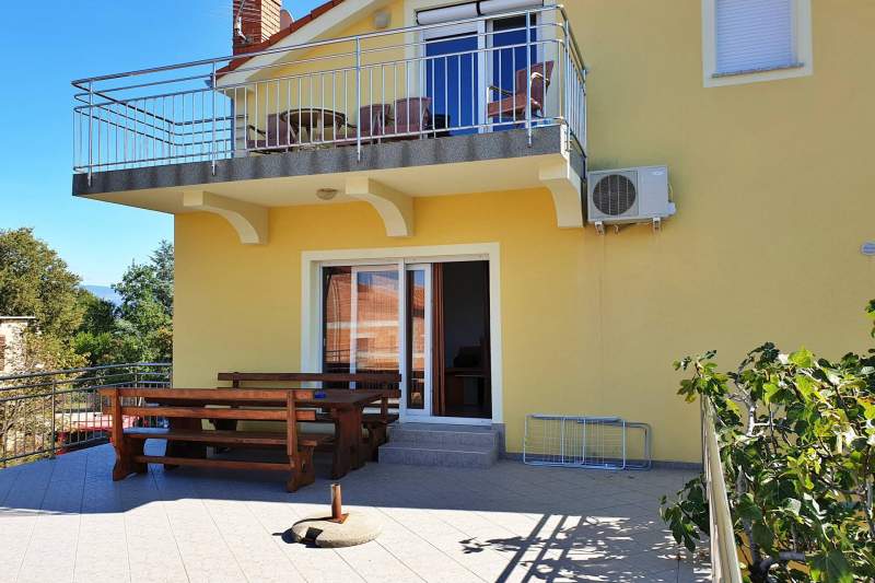 Ovaj apartman savršen je za 6-7 gostiju te nudi prekrasni pogled na more. Opustite se na terasi od 16 m2 ili balkonu od 8 m2. Privatni parking je odmah ispred, a centar mjesta i more udaljeni su samo 60 metara. Apartman ima tri spavaće sobe s bračnim krevetima, kauč na razvlačenje, dvije kupaonice (jedna s kadom, jedna s tušem) i dva klima uređaja. Moderna kuhinja je potpuno opremljena. Vlasnik ne stanuje u kući, što Vam osigurava dodatnu privatnost. Kućni ljubimci su dobrodošli uz nadoplatu.
